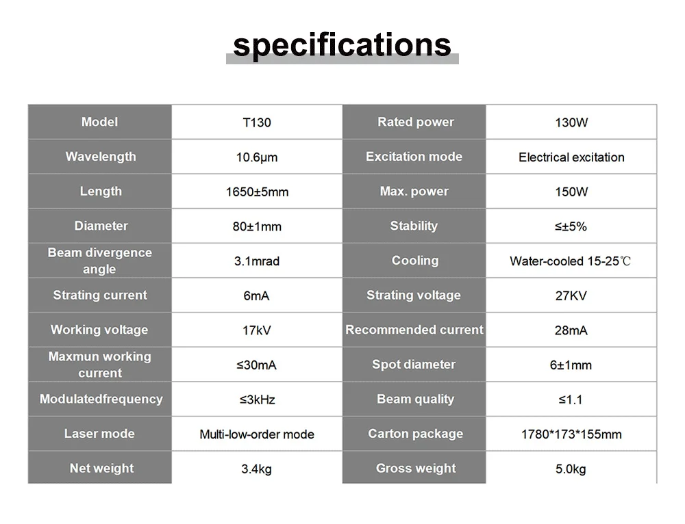 QDLASER SPT T130 130-150W Co2 Laser Tube Length 1650mm Dia 80mm for CO2 Laser Engraving And Cutting Machine