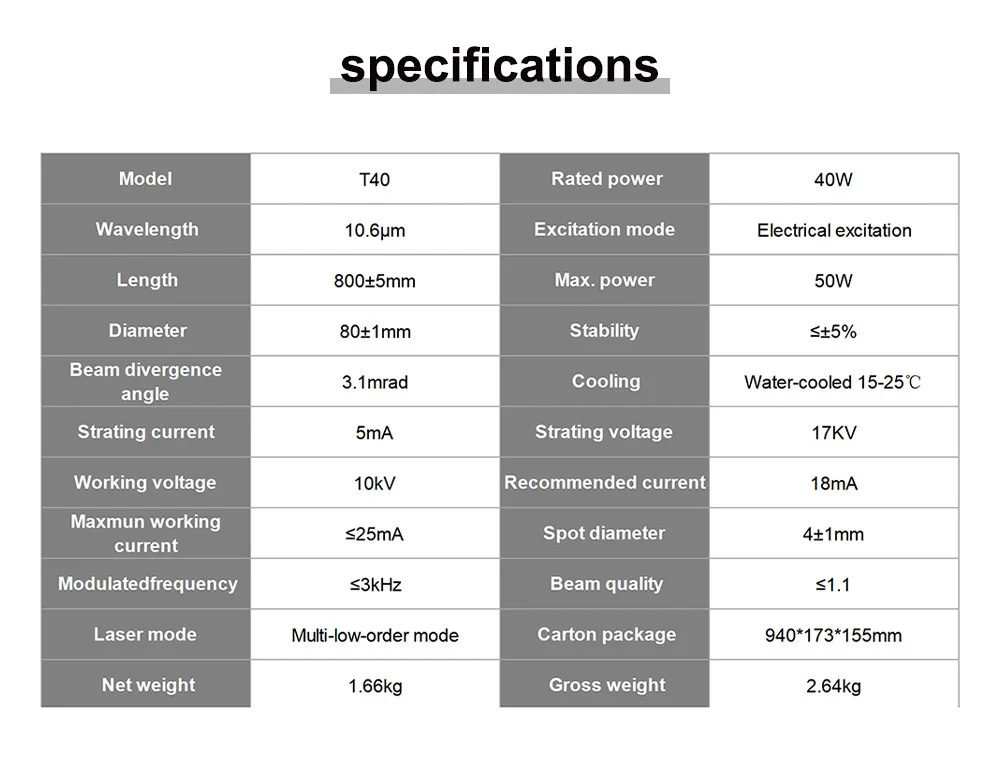 QDLASER SPT T40 40-50W Co2 Laser Tube Length 800mm Dia 80mm for CO2 Laser Engraving and Cutting Machine