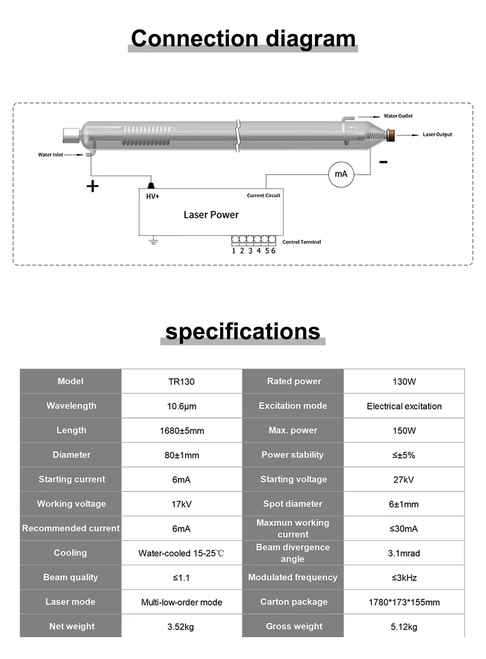 QDLASER SPT TR130 130-150W Co2 Laser Tube Length 1680mm Dia 80mm for CO2 Laser Engraving and Cutting Machines