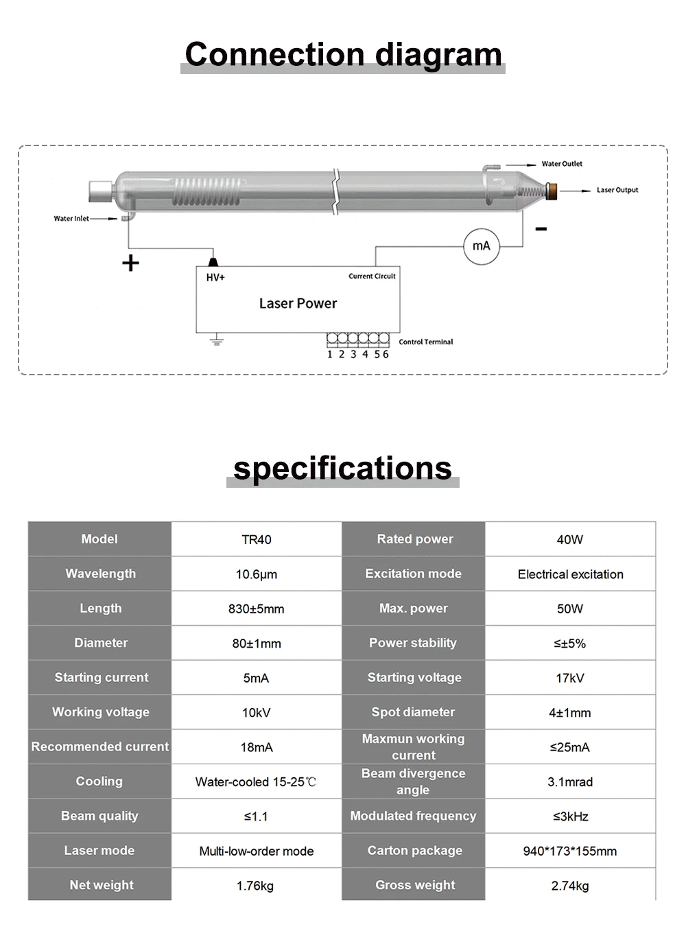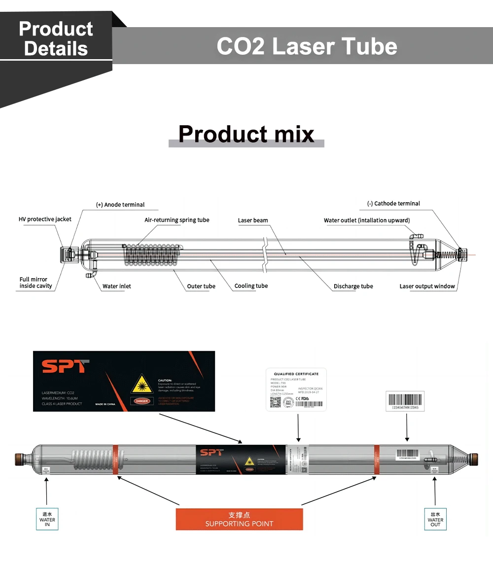 QDLASER SPT TR40 40-50W Co2 Laser Tube Length 830mm Dia.80mm for CO2 Laser Engraving And Cutting Machine