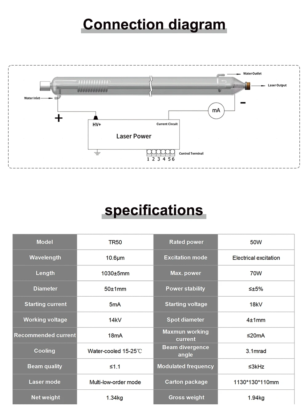 QDLASER SPT TR50 50-70W Co2 Laser Tube Length 1030mm Dia.80mm for CO2 Laser Engraving And Cutting Machine