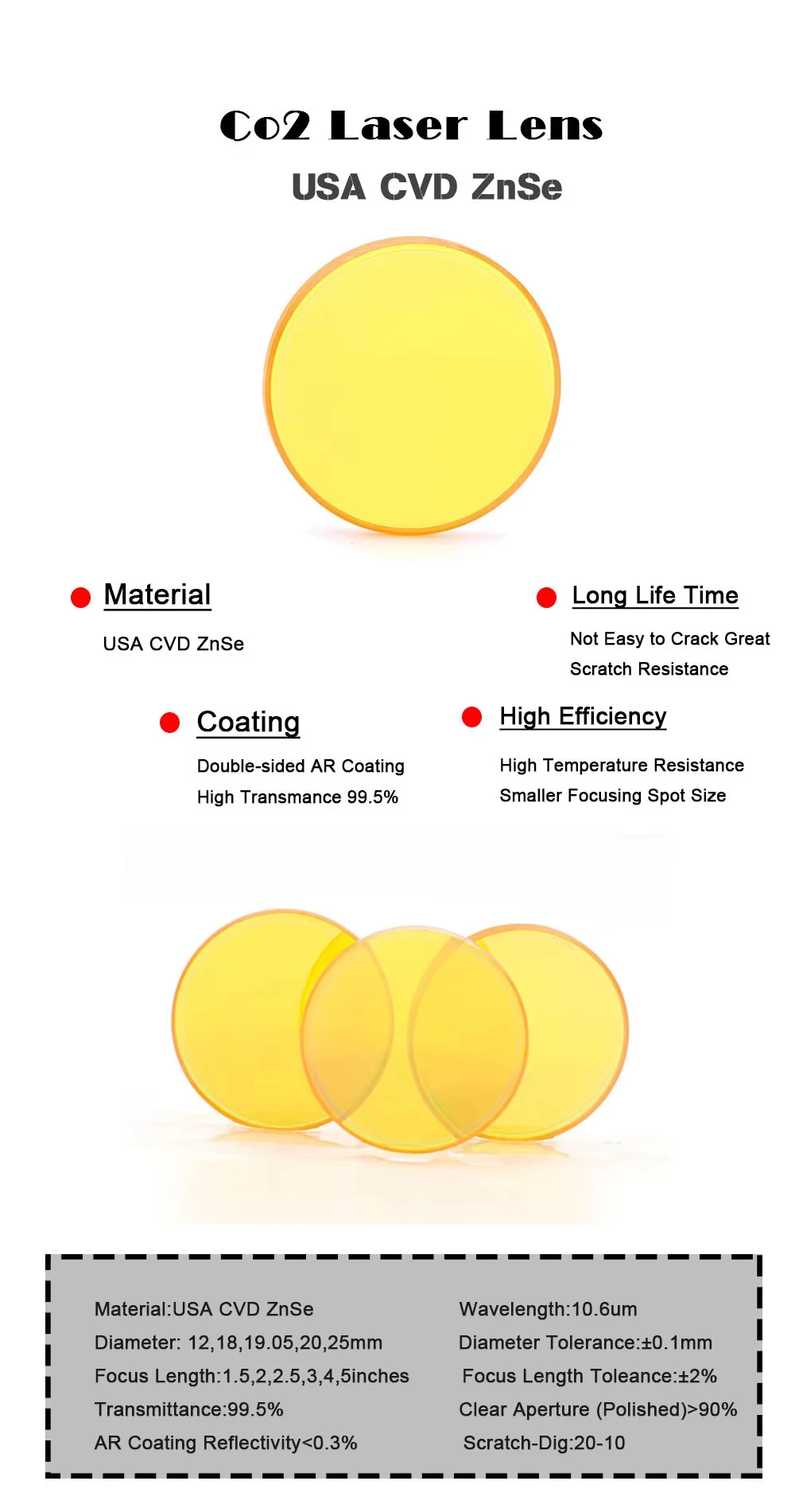 USA CVD ZnSe Laser Focus Lens Dia. 25/25.4mm FL50.8/63.5/101.6mm 2-5" for CO2 Laser Engraving Cutting Machine