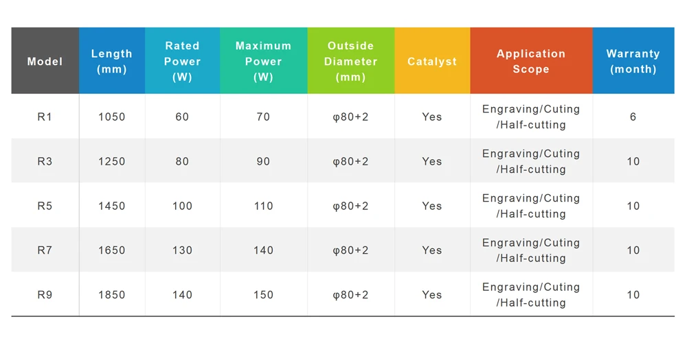 Yongli R7 Co2 Laser Tube 130W Rated Power 150W Max Power 1650mm Length 80mm Diameter for Laser Tube Cutting